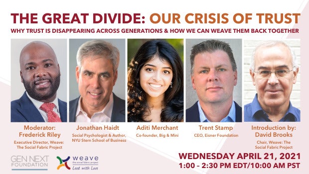 Social trust isn’t just a warm, fuzzy idea. If we don’t have it, democracy grinds to a halt. People feel unmoored. Mental illness, suicide, violence and loneliness increase. Neighbors don’t know or rely on each other. Join Weave: The Social Fabric Project and the Gen Next Foundation to discuss why trust is disappearing in our nation, particularly across generations, and what we can do to weave together a nation that is tearing apart at the seams.