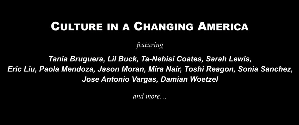 Participants will include: Nisha Agarwal, Karlyn Boens, Lil Buck, Ta-Nehisi Coates, Randy Cohen, Negin Farsad, Tom Finkelpearl, Ashley Gong, Warrington Hudlin, Elizabeth Hutchinson, Ric Leitchung, Madeleine LeCesne, Sarah Lewis, Eric Liu, Paola Mendoza, Jason Moran, Christopher Myers, Mira Nair, Nkosi Nkululeko, Toshi Reagon, Yosimar Reyes, Reggie Roc, Sonia Sanchez, Jose Antonio Vargas, Carrie Mae Weems, Deborah Willis, Damian Woetzel, Erika Wurth