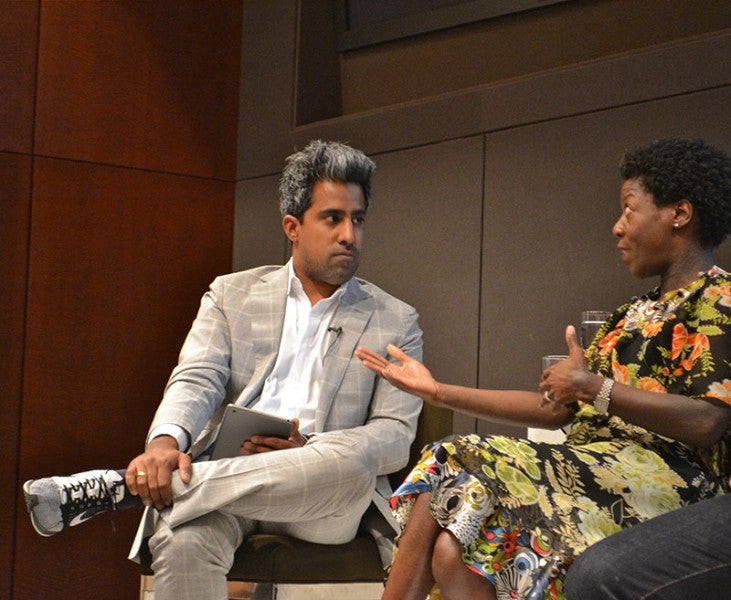 Anand Giridharadas, New York Times columnist and panel moderator, with Thelma Golden, director and chief curator of The Studio Museum in Harlem, at an Aspen Across America event in New York, NY. (Photo Credit: Patricia King)