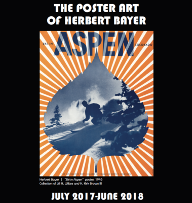 The Poster Art of Herbert Bayer features a selection of posters by the artist from 1947 to 1981 showcasing his talents as a graphic designer and typographer. Herbert Bayer was born in Austria in 1900. He began his artistic career as a student at the Bauhaus, the famous German School of design, and later became a teacher there. Bayer spent his life as an innovator exposing the principles of the Bauhaus, the union of art and design, in a wide range of fields including painting, sculpture, typography, photography, advertising, environmental forms, and architecture. Before immigrating to the United States in 1938, Bayer spent time as the Art Director of Vogue magazine’s Berlin office. His contributions to the fields of graphic design, typography and advertising were many. Of particular note was his design for a typeface that consisted of entirely lowercase letters. In 1946, as an advertising consultant to Water Paepcke, who was one of the main supporters of development of Aspen, the Aspen Institute, and the owner of the Chicago-based Container Corporation of America, Bayer moved to Aspen, Colorado where he spent much of his time designing architecture and posters for the local community. Bayer became the design consultant for the development of Aspen as a ski resort and cultural center, and architect for the Aspen Institute. In the mid-1970s Bayer relocated to Santa Barbara, California where he later died in 1985. Herbert Bayer’s legacy and strong artistic influence in Colorado continues to inspire regular exhibitions of his work. -Shana Shelby