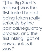 ML: When “The Big Short” came out, I started to get calls from senators, lots of senators, basically saying, “You explained to me how our financial system works. Can you come into my office so we can talk some more?” And my response was always, “You’re out of your mind. You are counting on me to explain to you how this all works? I’ve got these characters who know a lot of stuff, but everything I know is in the book, and I don’t know much beyond that.”