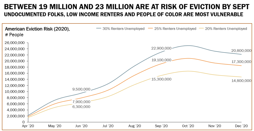 CEDP co-founder Sam Gilman reached the estimate by building a model that incorporated data on renter households’ income, savings, and housing cost burdens (a household is cost-burdened if they spend more than 30 percent of their income on housing costs such as rent or mortgage, utilities, insurance, taxes, and maintenance). The model also accounted for new income through stimulus payments, enhanced unemployment insurance, and state unemployment insurance in each of the 50 states and Washington, DC. This allowed the organization to predict how many renters are at risk depending on the level of unemployment renters are experiencing. If their unemployment rate is 25 percent, 19 million people would be at risk of eviction by September 30, as their unemployment benefits expire, stimulus payments are spent, and savings dwindle; that rises to 23 million if renters’ unemployment rate is 30 percent.