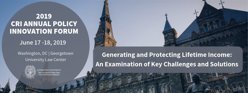Save the date for CRI’s invitation-only 2019 Annual Policy Innovation Forum on June 17-18, 2019 to be held at the Georgetown University Law Center in Washington, D.C. The theme for this year’s forum is “Generating and Protecting Lifetime Income: An Examination of Key Challenges and Solutions.”