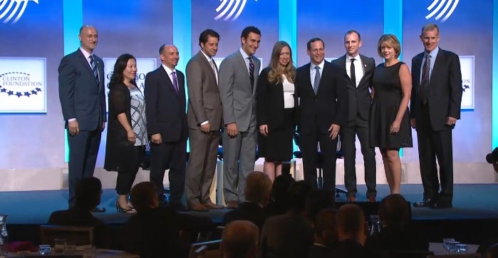 Franklin Project Leadership Council Chair General Stanley McChrystal (far right) and Franklin Project Director Jay Mangone (fifth from left) on stage with our National Service Alliance partners and funders at the 2014 Clinton Global Initiative conference