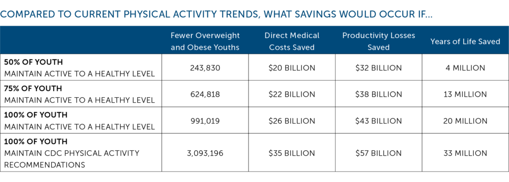At the request of the Aspen Institute, the Global Obesity Prevention Center at Johns Hopkins University simulated the physical activity behavior of youth during the years of 2010 to 2020. Included were scenarios where 50 percent, 75 percent, and 100 percent of the youth meet the standard of “Active to a Healthy Level” (25 minutes of physical activity, three times a week) and 100 percent meet the Centers for Disease Control and Prevention (CDC) recommendation (one hour of physical activity, daily), compared to current physical activity trends, as reported by the Sports & Fitness Industry Association.