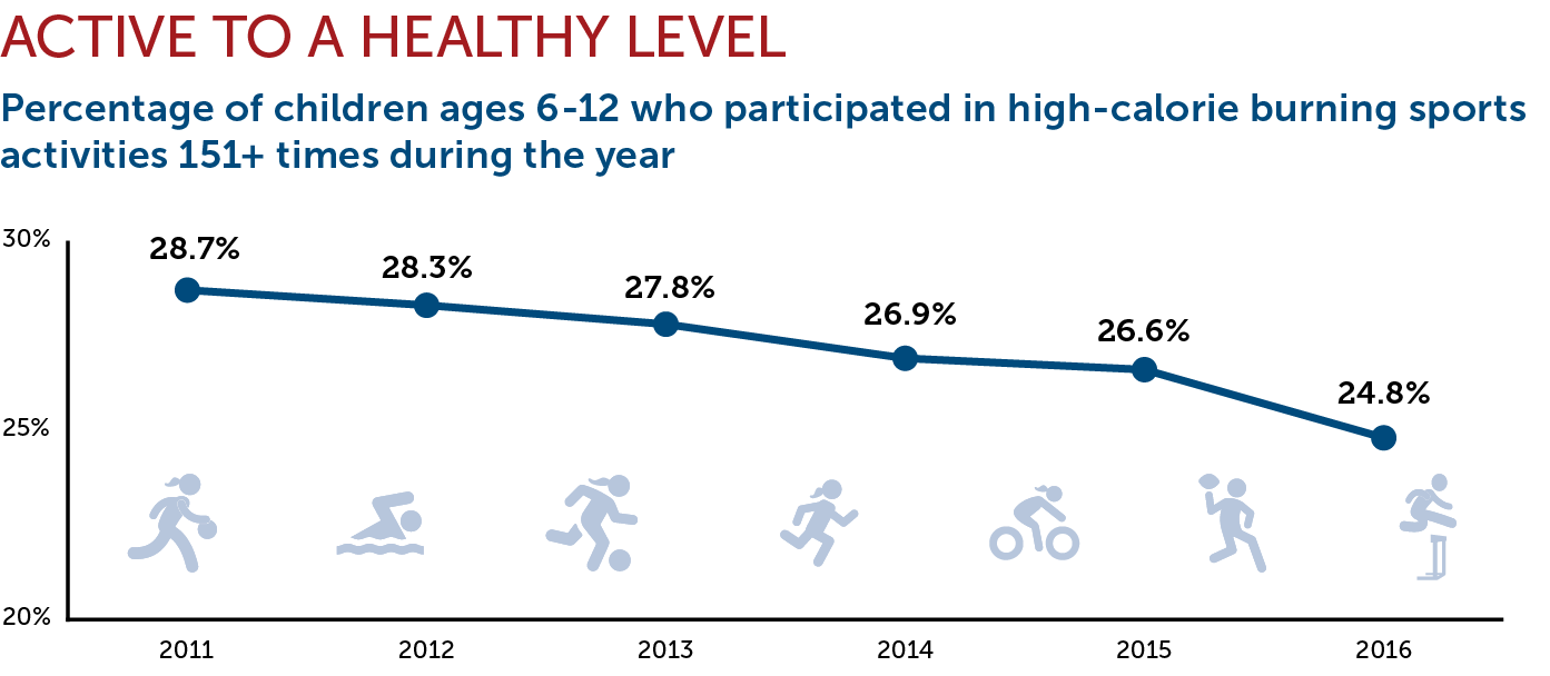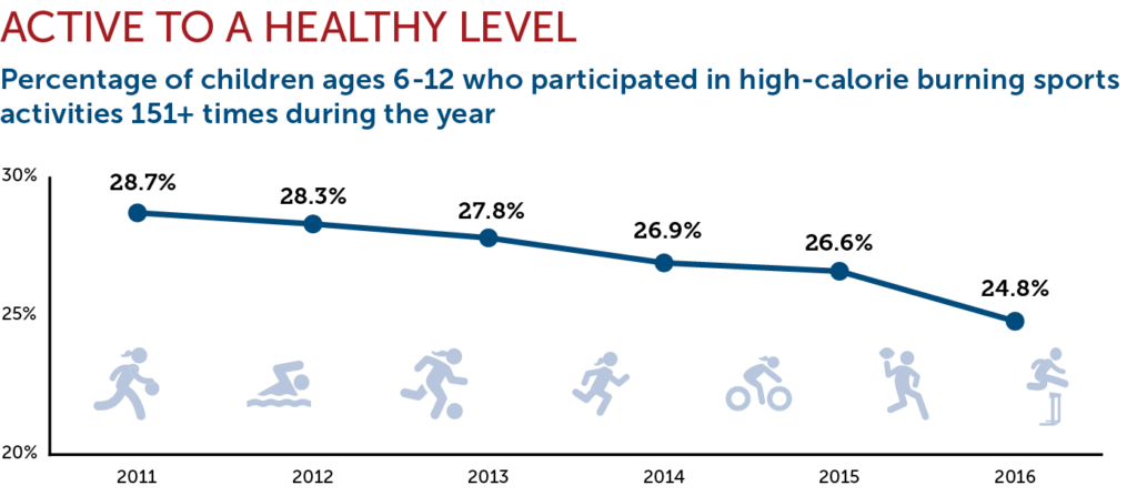 From 2011-15, the percentage of kids 6-12 who were considered active to a healthy level (151+ high-calorie burning sports activities during the year) slowly decreased. The decline was much steeper in 2016, dropping by nearly two percentage points.