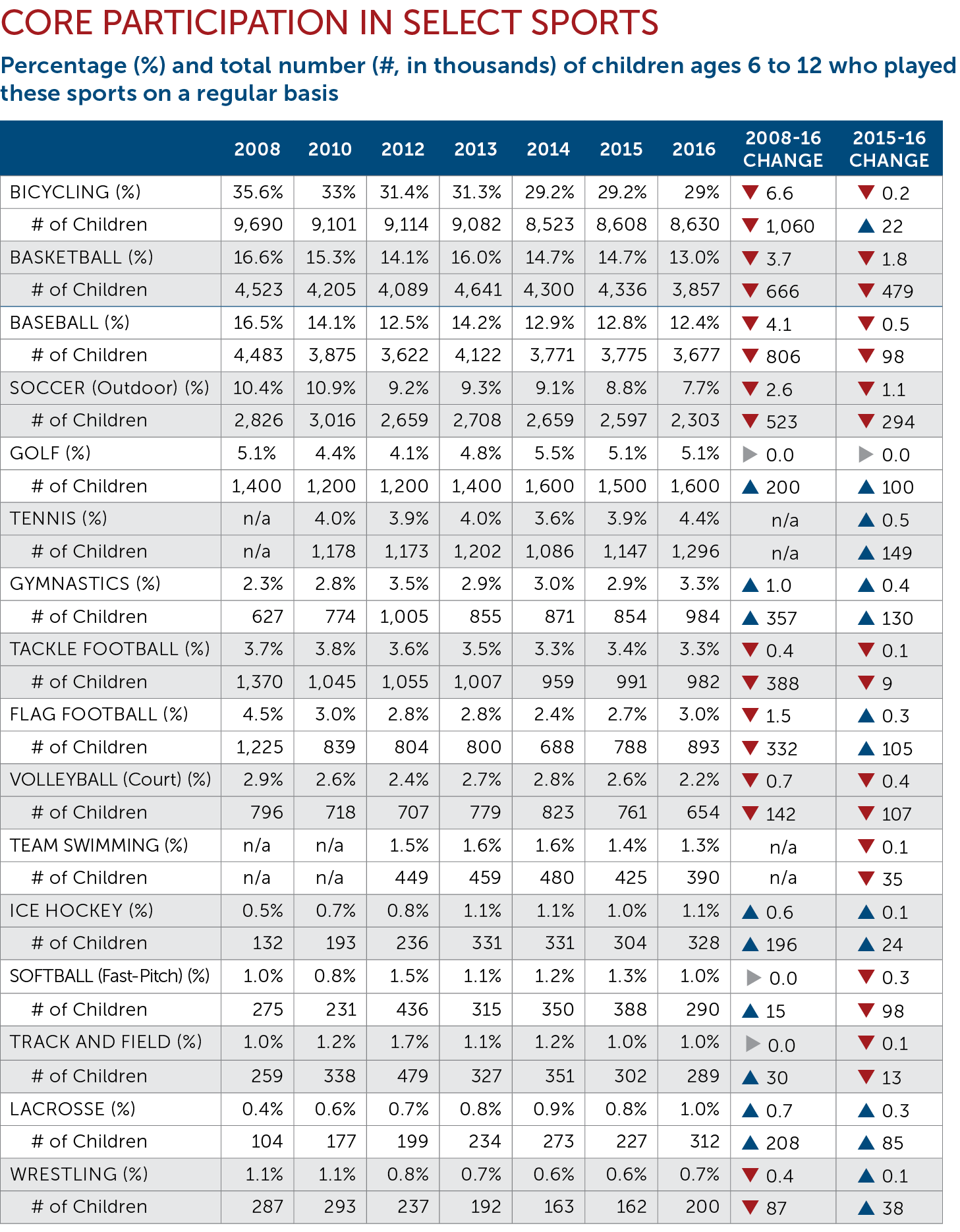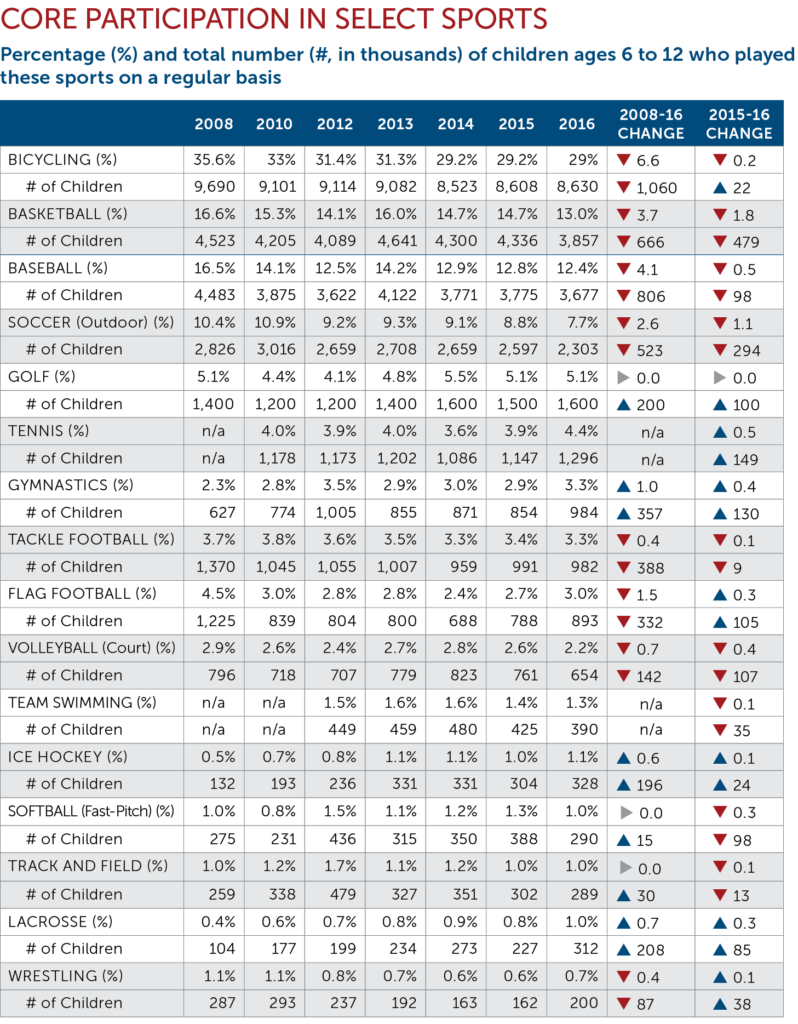 - For most sports, participation rates on a regular basis keep declining, with only gymnastics, lacrosse and ice hockey experiencing increases between 2008-16