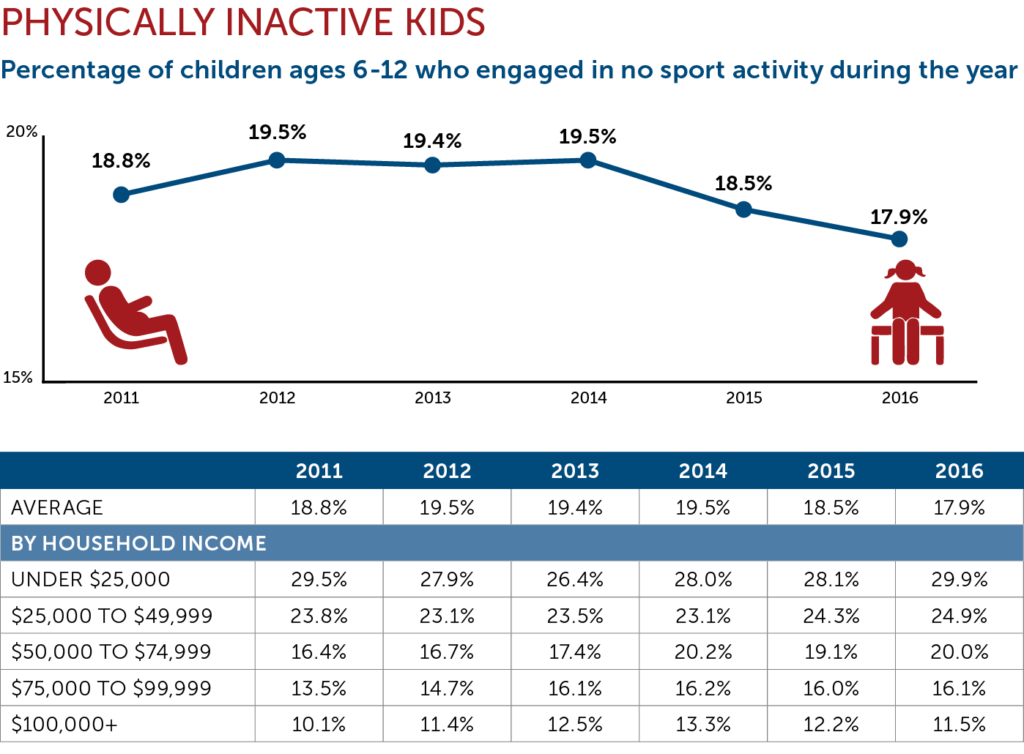 Money continues to be a major driver of sports participation. In 2016, 29.9 percent of kids from homes in the lowest income bracket ($25,000 or less) were physically inactive. Only 11.5 percent of children in the wealthiest households ($100,000 or more) were considered physically inactive.