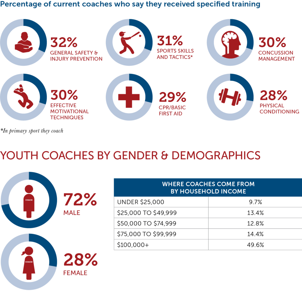 - Less than one-third of youth coaches are trained in competencies such as safety and sport instruction