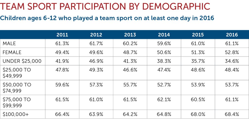 Household income is also a major factor for kids 6-12 who played a team sport on at least one day. In 2013, the gap between kids in homes with incomes under $25,000 and those with $100,000+ households was about 23 percentage points. In 2016, the gap had increased to 32 percent percentage points. Some positive news: The overall percentage of females playing a team sport at least one day continues to improve, and the overall percentage of boys has held steady.
