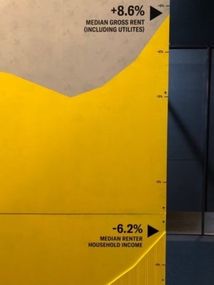 Eviction is highly correlated with poverty. Out of the 10.3 million renter households with an income below the poverty line, 71% are severely cost-burdened, spending more than half their income on housing. This cost burden can be detrimental for low-income families who may not have enough leftover income to cover other basic needs, such as food, healthcare, transportation, and childcare. In the Evicted exhibit stagnant incomes, higher rents, and a lack of public assistance are cited as the main causes of the eviction crisis (Image 1). The rising gap between household incomes and housing costs has created affordability problems for many families. Between 2000 and 2016, median gross rents have increased by 8.6% while median renter incomes have decreased by 6.2% (Image 2).