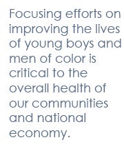 Focusing efforts on improving the lives of BMOC is critical to the overall health of our communities and national economy. Research conducted by Civic Enterprises in 2013 highlighted that among 16-24 year olds across the United States, 11.5 percent of white males are out of school and work, compared with 14.9 percent of Latinos and 24.9 percent of their African-American peers. While overall rates of disconnection from society are likely to trend down as the nation recovers from the Great Recession, history suggests that disconnected young men of color are in danger of being permanently left behind, and this has implications for future generations.