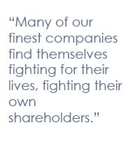 This situation has only gotten worse in recent years. Like DuPont, many of our finest public companies find themselves fighting for their lives, fighting their own shareholders.