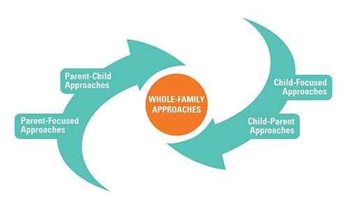 Two-generation approaches can be found along a continuum. This graphic illustrates the starting point (parent or child) and the relative emphasis.