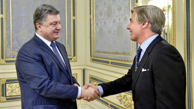 Aspen Institute Executive Vice President Elliot Gerson meets with Ukrainian President Petro Poroshenko in Kyiv, Ukraine. Gerson was in Ukraine to celebrate the work of Aspen Institute Kyiv, which launched last November. Aspen Institute Kyiv is dedicated to promoting values-based leadership in Ukraine and neighboring countries.