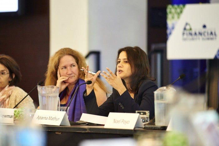 The second panel at the Summit focused on the changing nature of work and the roles of the government and employers in mitigating these labor market challenges. The panel featured Katherine Newman, Provost at the University of Massachusetts-Amherst; Aparna Mathur, Senior Fellow at the American Enterprise Institute; Bill Spriggs, Chief Economist of the AFL-CIO; Lata Reddy, Vice President of Corporate Social Responsibility at Prudential Financial and President of the Prudential Foundation; and Noel Poyo, Executive Director of the National Association for Latino Community Asset Builders (NALCAB); and was moderated by Maureen Conway, Executive Director of the Economic Opportunity Program at the Aspen Institute. The panelists identified stagnant wages, declining benefits in part-time and contingent work, and the lack of employment opportunities in minority communities as significant challenges to achieving financial security.