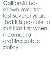 While Washington remains bogged down in partisan gridlock and political stalemate, California has shown over the last several years that it is possible to put kids first when it comes to crafting public policy. Lawmakers in California are forging a political path that protects and prioritizes the needs of kids.