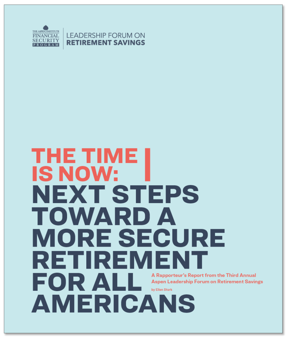 The Aspen Institute Financial Security Program lays out ways industry leaders and policymakers can improve Americans’ retirement outlook, including expanded access to plans and help with emergency savings.“Given the fact that nearly half of households headed by someone age 55 or older have no retirement savings and that one estimate puts the median retirement account balance across all savers at $40,000, the Aspen Institute Financial Security Program convened its third annual Leadership Forum on Retirement Savings. More than 70 experts and industry leaders explored feasible solutions over the course of two days. By Forum’s end, participants had identified five ideas most ready for advancement.”