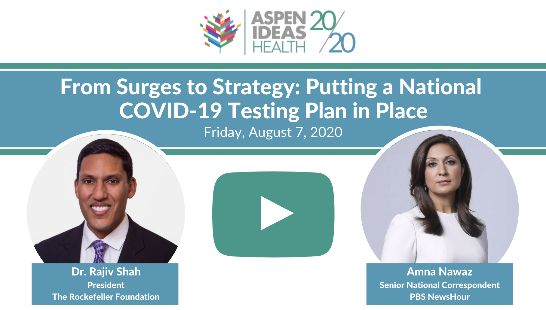 As COVID-19 cases continue to rise in the US, is it still possible to put an effective testing and tracing plan in place? The Rockefeller Foundation has released a renewed national action plan outlining a way to reach 30 million tests per week by October, the number they believe is necessary to reopen communities and economies safely. Join Aspen Ideas: Health for a conversation with Rajiv Shah, President of the Rockefeller Foundation, and Amna Nawaz, PBS correspondent, about the importance of testing in the battle against COVID-19.