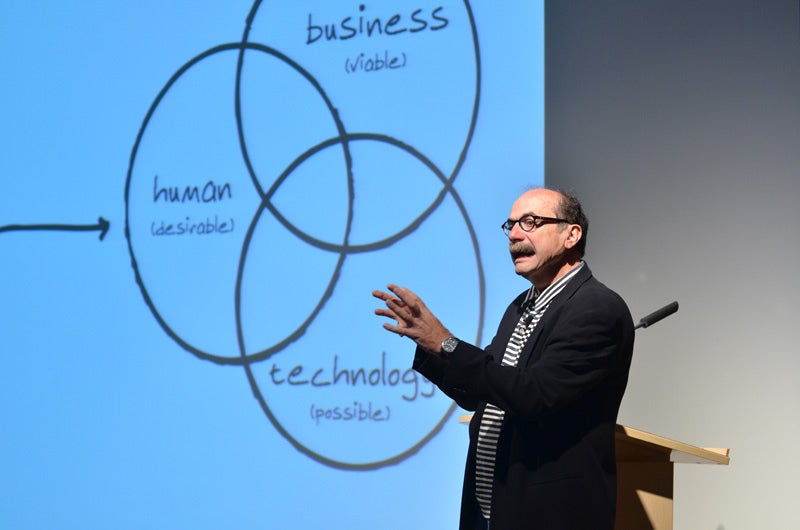 Kelley also spoke of creativity’s role in innovation and how to use it as a tool to prevent a company’s disruption by a competitor. Companies, he says, are like dinosaurs. If they don’t continue to innovate and creatively adapt to the changing world around them, they will die out.