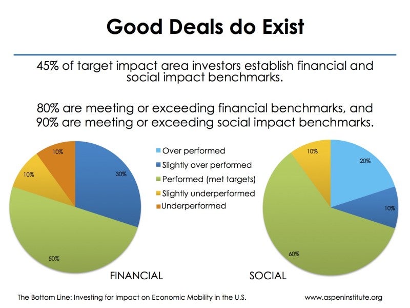 - Good investment deals that achieve both financial and social returns do exist: Forty-five percent of the impact area investors establish formal financial and social benchmarks. Of those, 80 percent said their portfolios are meeting or exceeding the established financial metrics, and 90 percent are meeting or exceeding the social metrics.