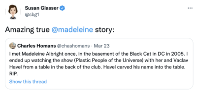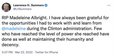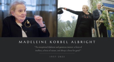 But Albright’s proteges surround us. Wendy Sherman, her devoted colleague for decades, is deputy secretary of state, and nearly every member of the Biden administration foreign policy team can trace a lineage to Albright. Albright had dizzying achievements in life. But she knew exactly where she stood and she never lost her balance.” -Excerpt from David Ignatius’ The Washington Post Remembrance of Madeleine Albright