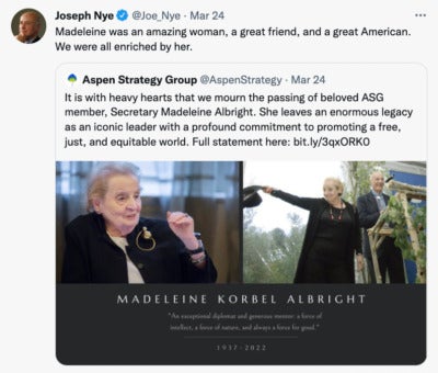 The Aspen Strategy Group and our members mourn the passing of our long-time member and dear friend, Secretary Madeleine K. Albright. Madeleine was an exceptional diplomat and generous mentor: a force of intellect, force of nature, and always a force for good. Her steadfast values, tireless work ethic, deep love of country, quick wit, and fierce loyalty set her apart—far apart. It was an honor to call her a friend and have her serve as a dedicated member of our group.Among the many well-sung accomplishments in her life, Secretary Albright is of course most often remembered as being the first female U.S. secretary of state and honored for all that she achieved in that role. She continued to advance American foreign policy well after her time as secretary ended, with the substance and style that was uniquely hers. To all our discussions and initiatives at the Aspen Strategy Group, she brought her experience, passion, and boundless energy for tackling seemingly intractable policy challenges for over 19 years. We will remember her too as an active listener and—in true ASG form—always eager to learn and have her viewpoint challenged. At our last meeting in fall of 2021, on the topic of democracy, she memorably reminded us that while democracies have recently felt on the back foot, they are resilient and “freedom is poised for a comeback.” May we all help make that true.Throughout her career Secretary Albright devoted much time to mentoring the young professionals and students around her. She took pride in helping carry the torch of our co-founder Lt. General Brent Scowcroft by taking special interest each year in mentoring and speaking privately with our ASG Scowcroft Fellows on the sidelines of our meetings. The lives she impacted and improved were many. We are grateful that ours and those of our members were among them.We have lost a beloved member and friend. It was a privilege to know her and to be better for knowing her. -Joe Nye, Condi Rice, Anja Manuel, Niamh King, and Leah Bitounis