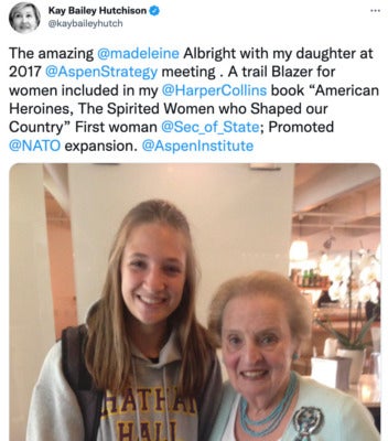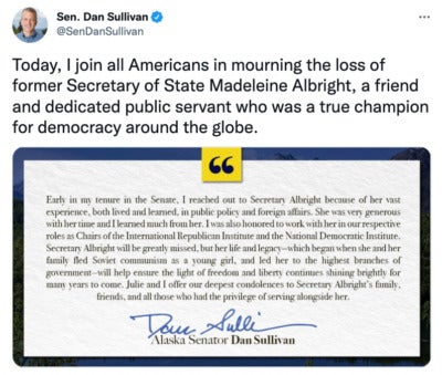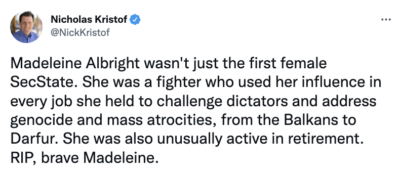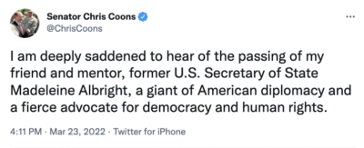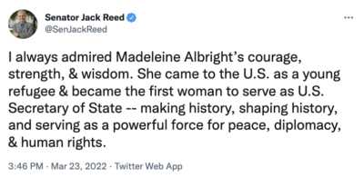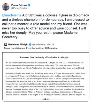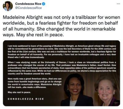 “The United States lost today an elder statesman and towering figure in the field of foreign relations. I was deeply saddened to learn of the passing of Secretary Albright, a woman who lived an amazing life and was an inspiration to so many…Secretary Albright was so vibrant and her experience made her a force to be reckoned with. She helped build coalitions with our allies and refused to give in to the bullying of dictators. She never failed to speak her mind, and she was confident that she could help make the world a better place. Even after leaving political office, Secretary Albright’s insights and expertise helped shape U.S. diplomacy and foreign policy.