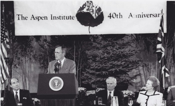Aspen Institute President David McLaughlin looks on as US President George H. W. Bush speaks.