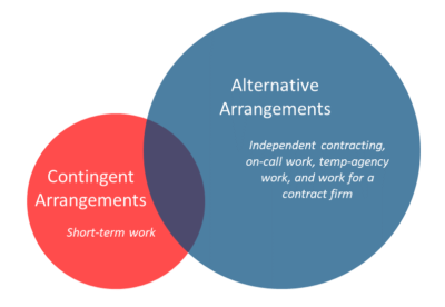 The CWS estimates the number of American workers in contingent and alternative arrangements as their main job. These are two separate categories. Contingent arrangements are short-term or temporary jobs; people surveyed expect them to end within a year.[2] Alternative arrangements are particular types of relationships between workers and the individual or company who pays them: independent contractors, temporary help agency workers, on-call workers, and workers provided by contract firms. What brings these categories together as “alternative” is that workers in all of them are not employed directly or regularly by the company at which they report to work on a daily basis.