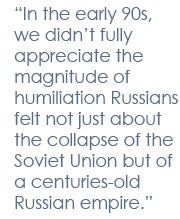 Gates added to this sentiment. “In the early ’90s, we didn’t fully appreciate the magnitude of humiliation Russians felt not just about the collapse of the Soviet Union but of a centuries-old Russian empire,” said Gates, who added that Putin has been trying to upend two aspects of international order that were thought to be settled at the end of the Cold War: border changes by anything other than peaceful negotiation, and the freedom of sovereign states to choose which countries they want to ally with.
