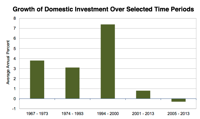 While our assertion of investment weakness may be a surprise to some, a few numbers help solidify the case. In 2014, real GDP was 8.7 percent above the level it reached just prior to the onset of the Great Recession in late 2007, yet gross private investment was just 3.9 percent higher. What’s more revealing, however, is private investment net of depreciation, since this is a better measure of keeping up production and innovation capacity. Net private domestic investment was just $524 billion in 2013 (the last year for which we have good data), compared to $860 billion in 2006, the high level prior to the Great Recession. Figure 1 above gives graphic illustration of the trends since 1967, showing that the downturn started after the dot-com bubble, and accelerated with the Great Recession. The impact of this weakness can be measured in the much slower-than-average recoveries to the last two recessions and especially to a slowdown in productivity growth. Labor productivity, for instance, grew at only 1.5 percent between 2006 and 2014, and just 0.7 percent after 2011. These numbers compare poorly to the 7.3 percent average growth between 1967 and 1973 and 3.2 percent between 1996 and 2004.