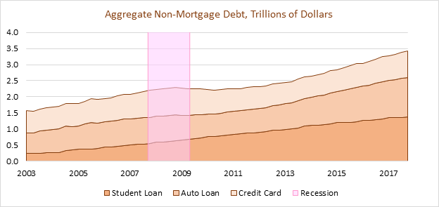While falling savings rates are on their own cause for concern, the drop has been accompanied by a steady increase in consumer debt, which reached a historic high of $13.2 trillion in the fourth quarter of 2017. While mortgages make up two-thirds of consumer debt, total outstanding mortgage debt remains just below pre-Recession levels. Aggregate auto, student loan, and credit card debts, by contrast, have collectively increased by 51 percent over that time and now top $3 trillion, as the graph below illustrates.