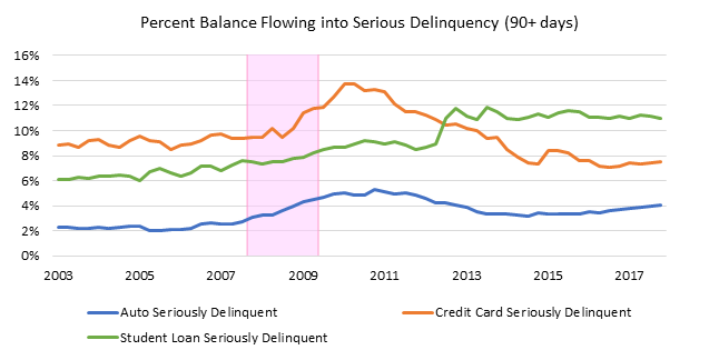 Delinquency and default rates provide warning signs about the sustainability of these record levels of debt. For example, more than 10% of student loans are seriously delinquent, and Federal Reserve officials believe that delinquency levels could actually be twice as high due to the impact of deferment, grace periods, and forbearance on the repayment cycle. Subprime auto delinquency, meanwhile, has doubled since 2011. This is “where the pressure is” according to Fed officials, who believe that increases in prime auto loans are “masking the sharp rise in subprime delinquency.”