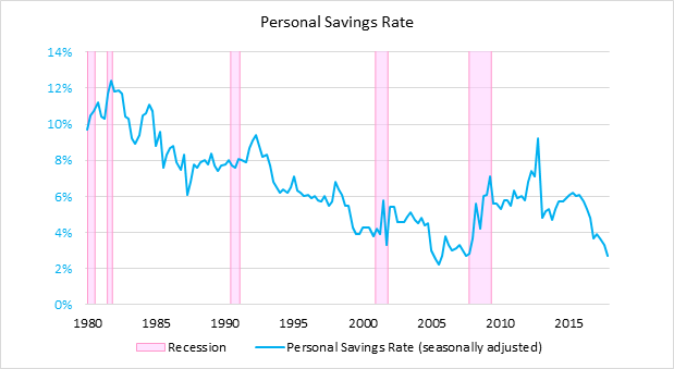 In December 2017, the personal savings rate dropped to 2.4%, the third-lowest rate ever recorded. Notably, the lowest rates on record are from 2005, at the height of the credit boom that fueled the Great Recession. While the rate has rebounded slightly in 2018, the trend is striking. In 2011, the savings rate reached 9% as families built up rainy-day funds, but has since taken a nosedive. As the graph below shows, there has been a dramatic drop in the saving rate over the last two and a half years.