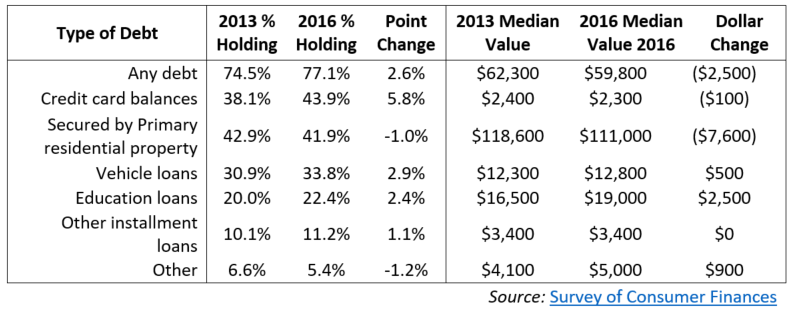 During the recovery from the Great Recession, a greater portion of Americans took on debt, and median debt levels generally rose. While fewer Americans held mortgage debt in 2016 compared to 2013, all other major categories of debt became more common for US households, as indicated in the table below.