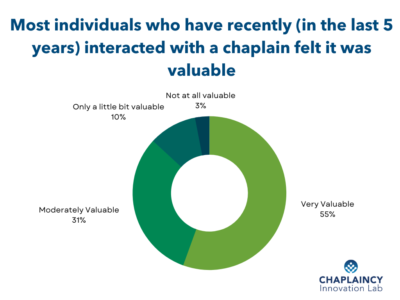 Last March, we at the Chaplaincy Innovation Lab partnered with Gallup to conduct the first detailed national survey about the general population’s interactions with chaplains. Chaplains are spiritual care providers who work outside of churches and other places of worship, in secular settings such as hospitals, the military, universities, and prisons. Chaplains provide spiritual care to all faiths and none, regardless of their own religious tradition. Until now, little data about how the general population interacts with chaplains has been available. The new survey the Chaplaincy Innovation Lab provides answers two important questions: Who do chaplains care for? And how do people experience those interactions?Gallup collected responses from over 1,000 people across the U.S. About 25% of Americans reported interacting with a chaplain at some time during their lives. Fourteen percent of Americans interacted with a chaplain in the past five years. About half of interactions took place in healthcare settings, including hospitals, palliative care, or hospice. The word most commonly used to describe chaplains by those who had interacted with a chaplain was “compassionate” (selected by 95% of respondents). The full report on the survey results, with additional detail and data, is available on the Lab’s website.