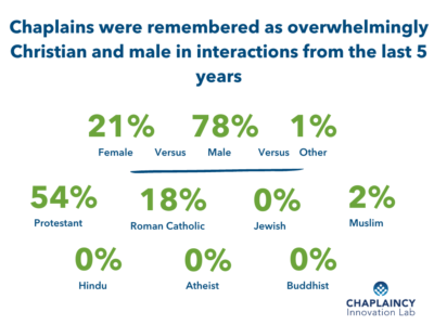 Chaplains seem to be serving the whole population, but while recipients of care are diverse, providers of spiritual care, or chaplains, are less diverse. Chaplaincy has a way to go if we hope to match the diversity of recipients with the diversity of providers. Historically, the leaders and gatekeepers in professional chaplaincy were overwhelmingly white, male, and Christian. The profession has feminized and slowly diversified, but much progress needs to be made. Despite the long and important history of Black chaplains in the United States, Black chaplains and other chaplains of color are underrepresented among board-certified chaplains, a challenge the Lab is addressing through a range of efforts. These survey results illustrate that most people remembered interacting with a chaplain who was male (over 80% of interactions) and who was perceived to be Christian (over 70% of interactions). This may not reflect the true population of chaplains in the United States, but it does reflect who people think of when asked to recall a chaplain with whom they have interacted. We must ask what sorts of barriers have created such a homogeneous field, and if this homogeneity is really in the interest of robust, effective spiritual care. Justice and effectiveness are both arguments in favor of diversifying the field of spiritual caregivers to more closely mirror the broader population.