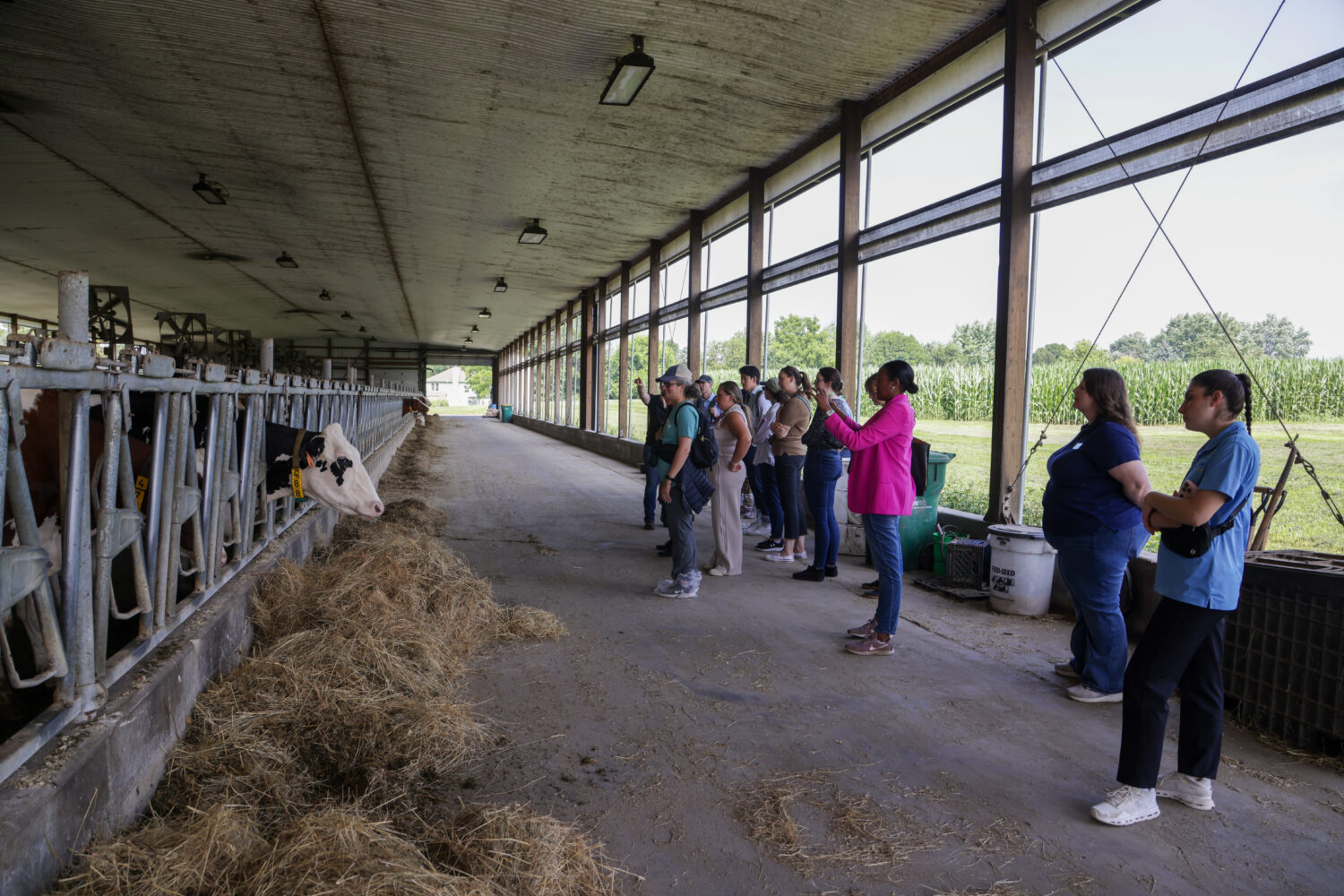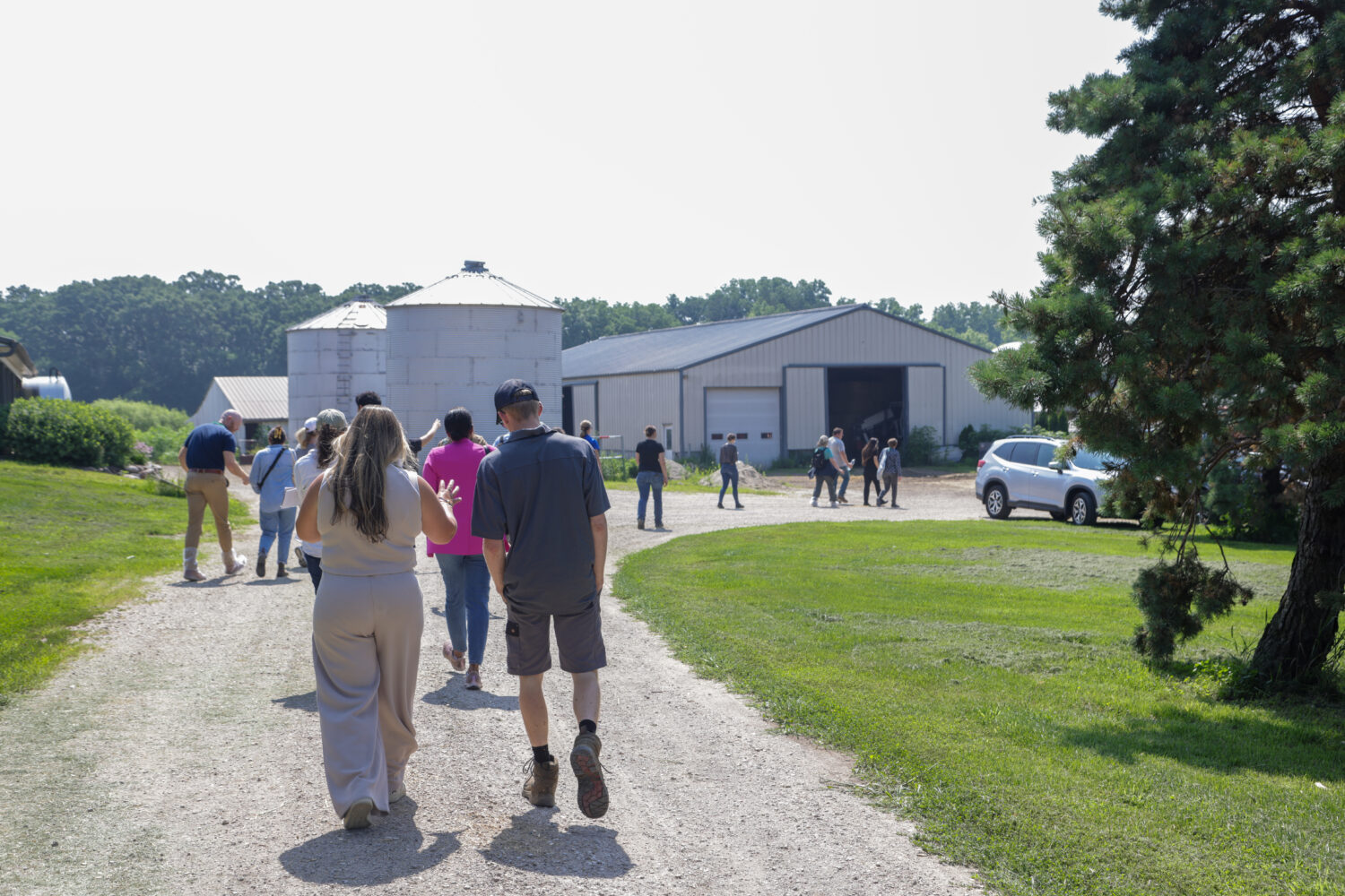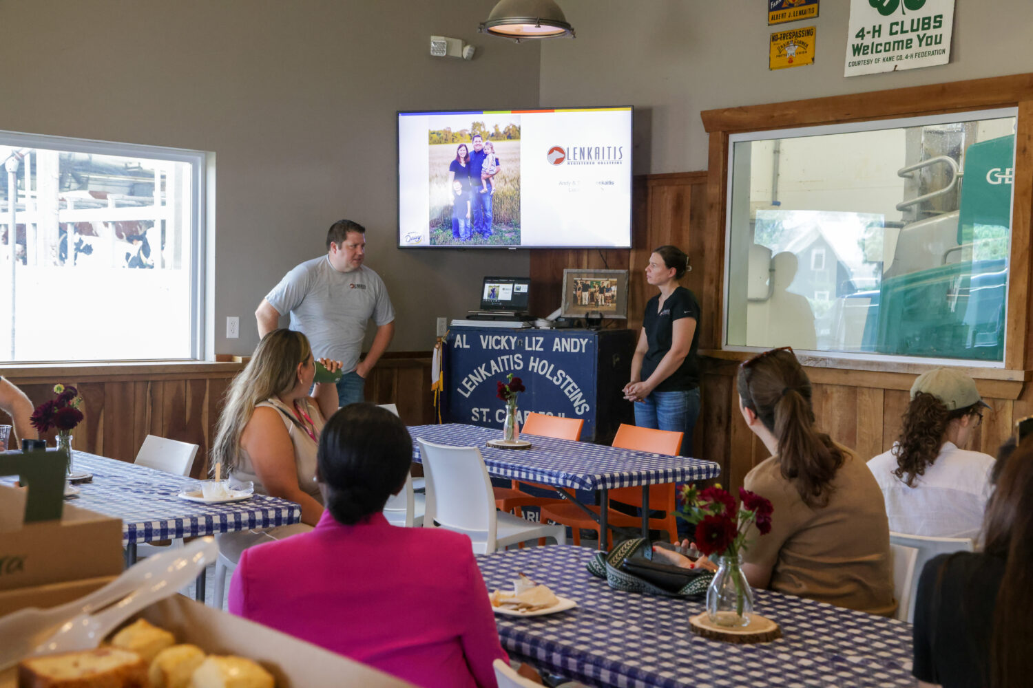 The group visited Lenkaitis Holsteins, a family-owned farm in Campton Hills, Illinois, where Andy and Sarah Lenkaitis shared their journey of blending tradition with innovation. Their story stretches back to 1983, when Andy’s parents first started the farm. Today, as second-generation farmers raising their son Lucas on the same land, Andy and Sarah carry forward a legacy of stewardship with a commitment to sustainability, community, and animal care.
