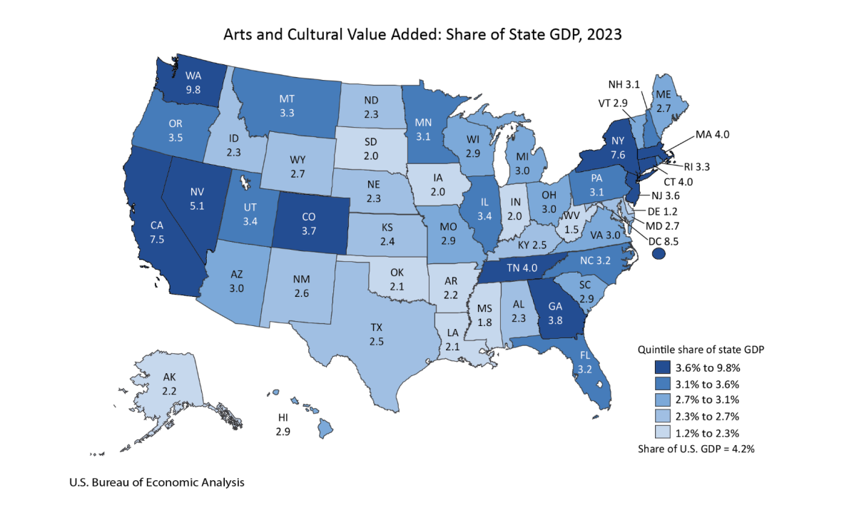 At its most basic, the creative economy is the ecosystem of artistic activity that includes the people, processes, places, and products that create what we consume as culture. It’s a really big show. The US Bureau of Economic Analysis’s most recent figures, from 2023, show the arts and culture in the US represent: