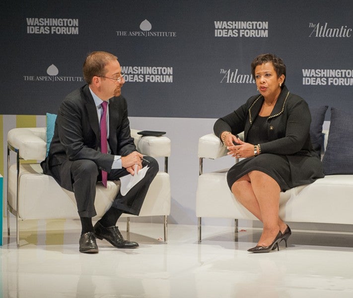US Attorney General Loretta Lynch discusses recidivism rates with “Meet the Press” moderator Chuck Todd at the 2015 Washington Ideas Forum.