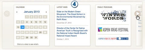 4. A series of scrolling infoblocks, such as a calendar and latest news and blog posts, allows users to navigate to events, see the latest news about the Institute and learn more about select events directly from the homepage.