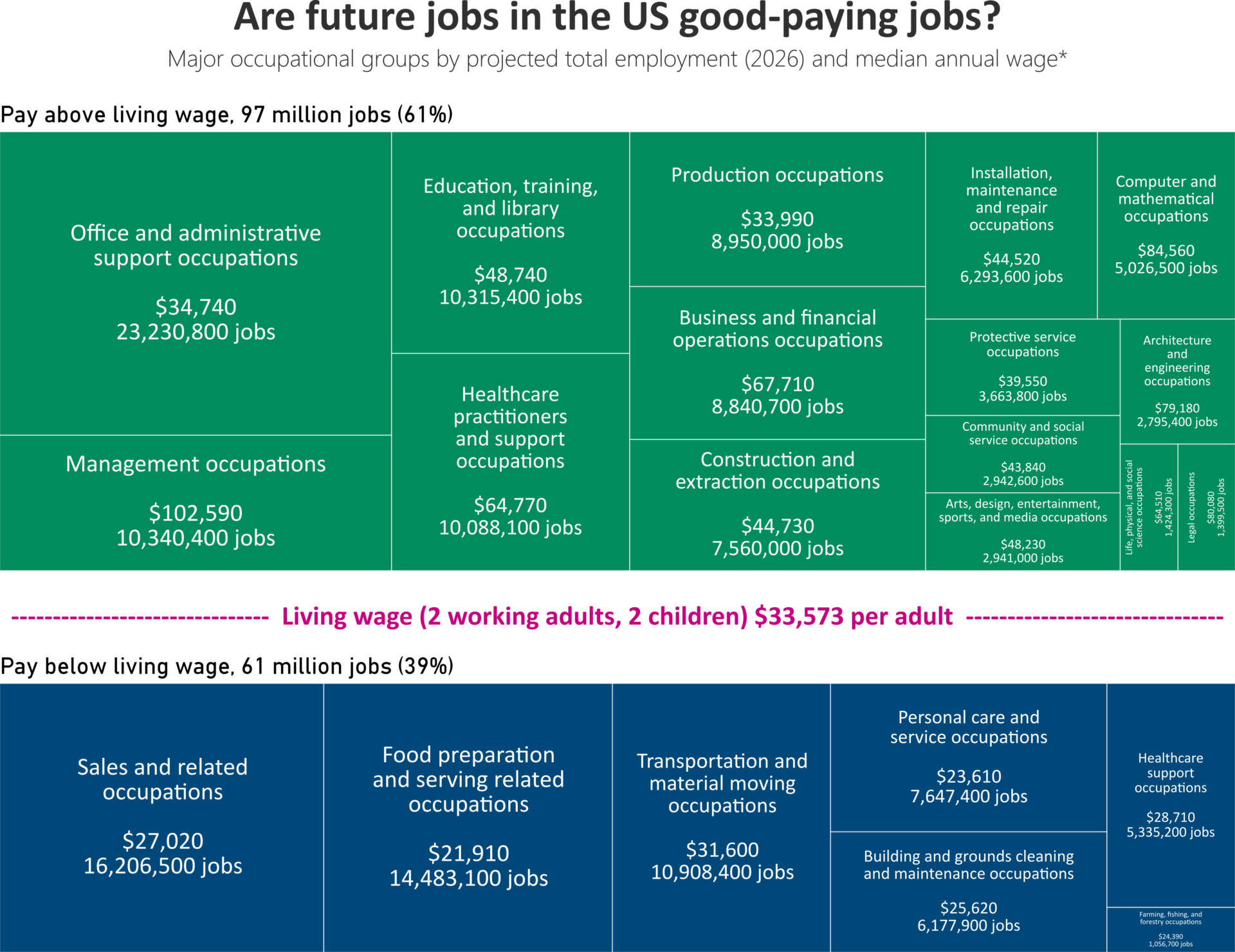 Data suggest the trend of too few good jobs and too many poorly paying jobs may continue and possibly intensify. US Bureau of Labor Statistics data on median occupational wages, combined with some information from the MIT Living Wage Calculator, show in the graphic below that by 2026, an estimated 39% of projected employment will be in jobs where median earnings are insufficient to support a small family. (On mobile, pinch, expand, and slide to explore the wage projections for 2026 in various occupations.)