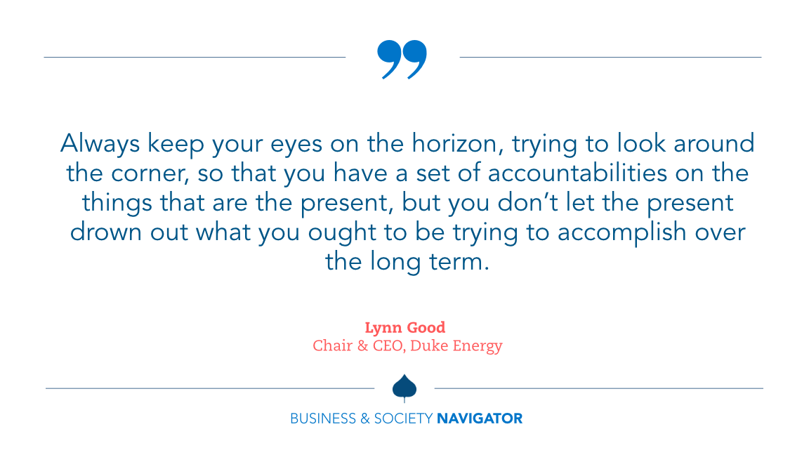 Lynn Good, CEO of Duke Energy, leads a firm that has to engage in scenario planning decades out to survive. She cautions us not to “let the present drown out what you are trying to accomplish for the long term.” Executives will be best situated to do this by avoiding knee-jerk reactions to the tsunami of headlines designed to confound and intimidate.