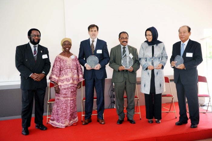 Pictured left to right, Dr. Mike Mbizvo, Professor at University of Zimbabwe College of Health Sciences and Former Director of the Department of Reproductive Health and Research at the World Health Organization, hosted the ceremony while Dr. Musimbi Kanyoro, Global Leaders Council member and President of the Global Fund for Women, presented the awards to: Ambassador Luis Enrique Chavez Basagoitia, Permanent Representative of Peru to the United Nations Office and Other International Organizations in Geneva, who accepted the policy development Resolve Award on behalf of Peru; and Honorable Dr. Seif Seleman Rashidi, Minister of Health of Tanzania, who accepted the service delivery Award on behalf of Tanzania. The Resolve Award Special Mention for policy development was presented to Afghanistan and was accepted by Honorable Dr. Suraya Dalil, Minister of Public Health of Afghanistan. Honorable Dr. Mam Bunheng, Minister of Health of Cambodia, accepted the service delivery Special Mention on behalf of Cambodia.
