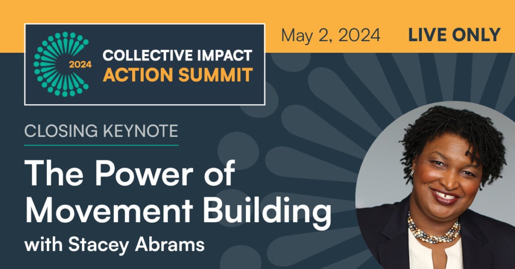 The Collective Impact Forum, a partnership between the Aspen Institute Forum for Community Solutions an FSG, invite you to join us this spring for the online 2024 Collective Impact Action Summit. Spanning three days and featuring over 30 virtual sessions, the 2024 Action Summit will elevate cutting-edge thinking and lessons learned on how collaboration can help address the complex issues we are facing. And mark your calendars for May 2 for a special live-only keynote conversation with political leader, voting rights activist, entrepreneur, bestselling author, and changemaker Stacey Abrams that will explore the power of movement building. The Collective Impact Forum, a partnership between the Aspen Institute Forum for Community Solutions an FSG, invite you to join us this spring for the online 2024 Collective Impact Action Summit. Spanning three days and featuring over 30 virtual sessions, the 2024 Action Summit will elevate cutting-edge thinking and lessons learned on how collaboration can help address the complex issues we are facing. And mark your calendars for May 2 for a special live-only keynote conversation with political leader, voting rights activist, entrepreneur, bestselling author, and changemaker Stacey Abrams that will explore the power of movement building.