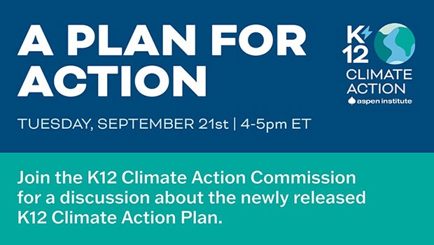 On September 21st, the Aspen Institute’s K12 Climate Action Commission will release an action plan and policy recommendations to help the education sector take action on climate change. The action plan will describe key challenges and opportunities related to mitigating climate change by reducing schools’ environmental footprints, adapting and building resilience to climate impacts, and educating students on climate change and sustainability, with a focus on advancing equity. The plan will also outline policy recommendations for the federal, state, and local levels to help schools take climate action.On September 21st, the Aspen Institute’s K12 Climate Action Commission will release an action plan and policy recommendations to help the education sector take action on climate change. The action plan will describe key challenges and opportunities related to mitigating climate change by reducing schools’ environmental footprints, adapting and building resilience to climate impacts, and educating students on climate change and sustainability, with a focus on advancing equity. The plan will also outline policy recommendations for the federal, state, and local levels to help schools take climate action.