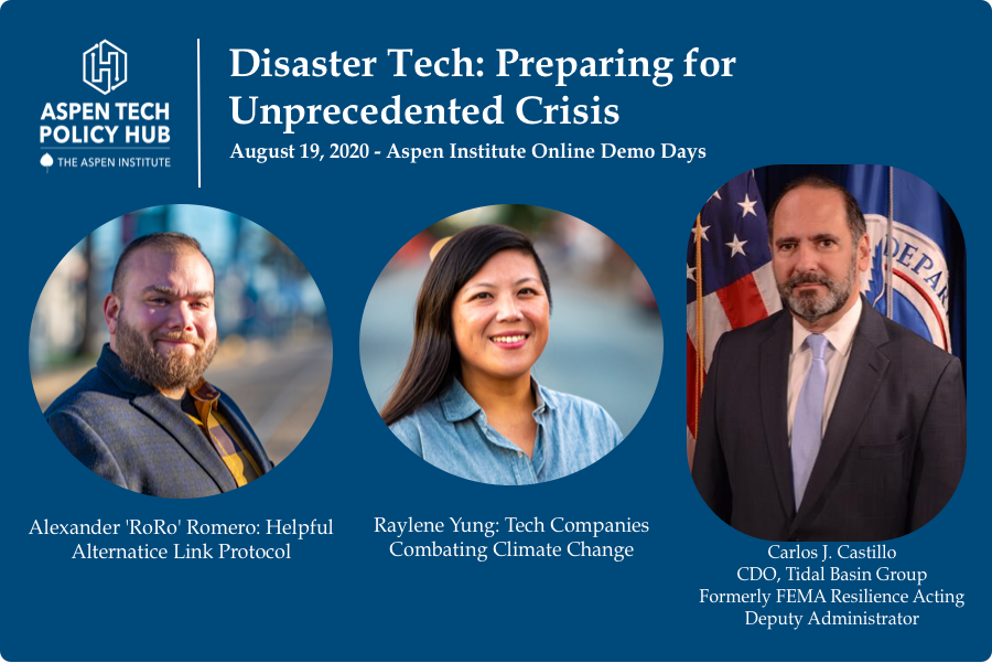 Join Aspen Tech Policy Hub Fellows as they showcase their projects focused on the theme: Disaster Tech: Preparing for Unprecedented Crisis. Following the presentations of the projects, Carlos J. Castillo, incoming Chief Development Officer of Tidal Basin Group, gave further remarks. The projects presented are: