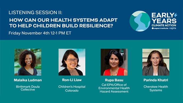 The effects of climate change can be particularly harmful to young children’s health, development, and school readiness. Extreme weather events, increasing air pollution, eco-anxiety, and toxic stress threaten the future of childhood. This second public listening session will focus specifically around the following question: How can our health systems adapt to help children build resilience?