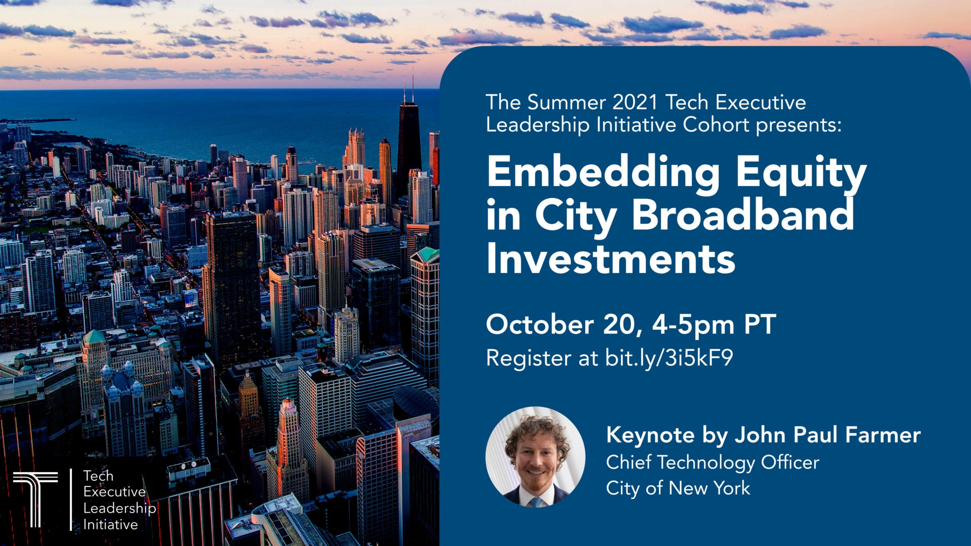 On October 20, 2021, the leaders of the Aspen Tech Policy Hub and the Tech Talent Project’s Summer 2021 Tech Executive Leadership Initiative Cohort showcased their projects focused on ‘Embedding Equity in City Broadband Initiatives.’ Following the presentations, John Paul Farmer, Chief Technology Officer of the City of New York, gave a keynote address.